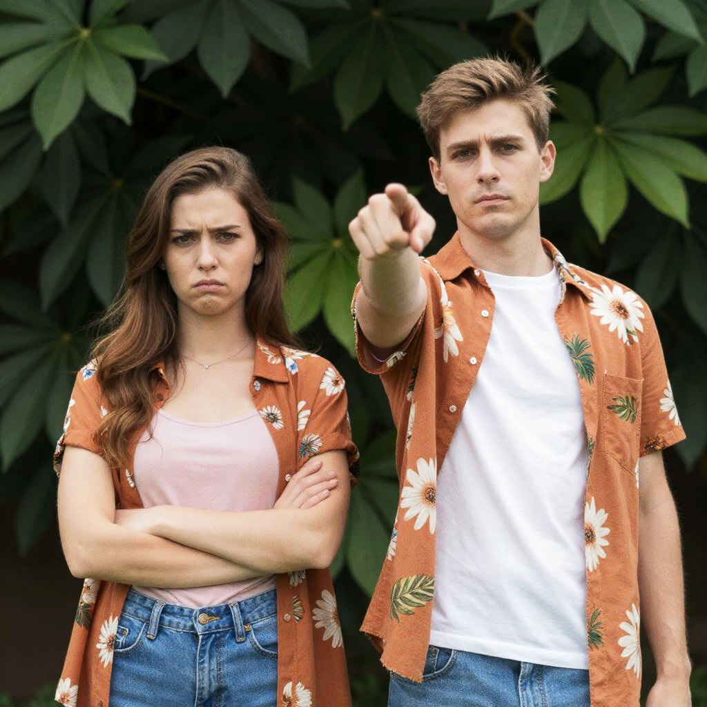 Photograph of a man and woman standing in front of a lush green leafy background. Both wear orange floral shirts over white and pink tops, blue jeans. Man points forward with right hand, woman crosses arms, frowning. Both have light brown hair. Man's expression is neutral, woman's is stern.