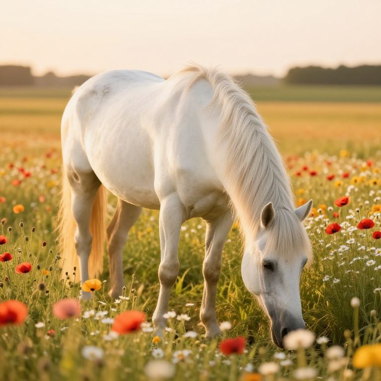 Horse in flower field, white mare grazing gently surrounded by blooming poppies and daisies, golden hour lighting, dreamy atmosphere with soft-focus background, peaceful countryside vibes