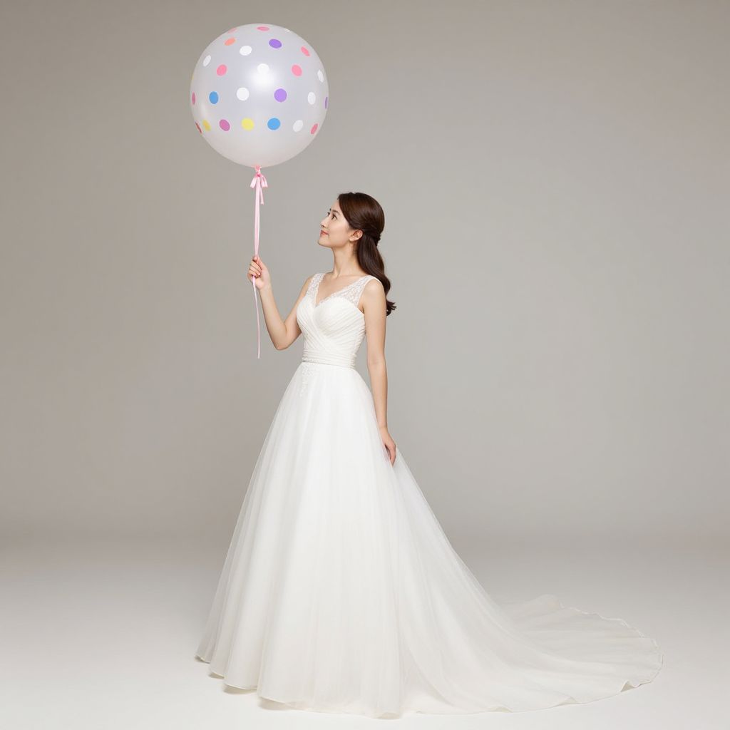 Photograph of a young Asian woman with fair skin and dark hair in an elegant updo, wearing a white, short-sleeved, V-neck wedding gown with a full, flowing tulle skirt. She holds a white balloon with multicolored polka dots in her right hand, gazing upward with a gentle smile. The background is a simple, gradient gray, emphasizing her and the balloon. The gown's fabric is smooth and satiny, contrasting with the balloon's textured surface. A white ribbon hangs from the balloon's stem. The overall style is modern and minimalist, focusing on the bride's delicate and joyful expression.