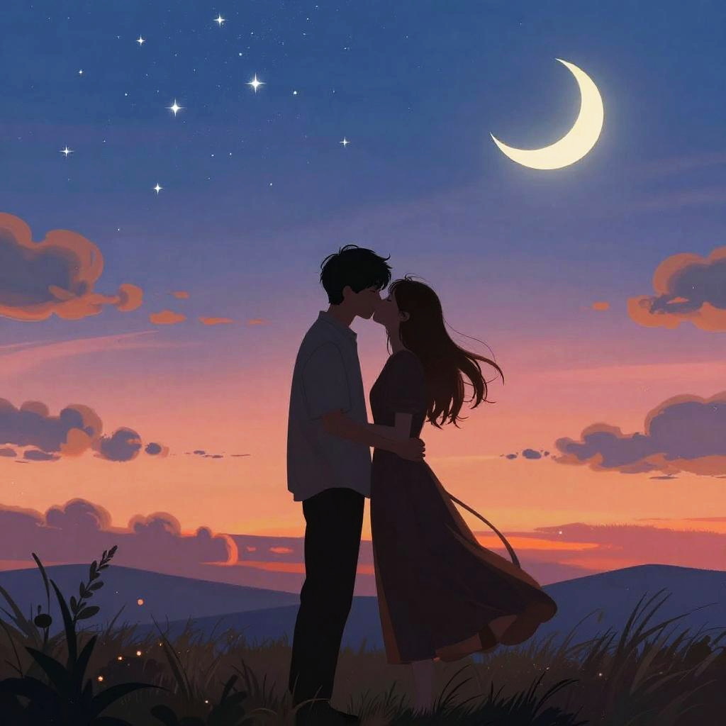 Digital illustration of a silhouetted couple standing in shallow water under a bright full moon. The woman, with long, wavy hair, wears a flowing dress, while the man, in a suit, holds her close. They are about to kiss, with ripples in the water around their feet. The night sky is dark, dotted with stars and a colorful nebula. The moon's glow illuminates their profiles, creating a romantic, dreamlike atmosphere. The background includes distant, dark hills. The image is highly detailed with a focus on contrast between the dark silhouettes and the bright moon.