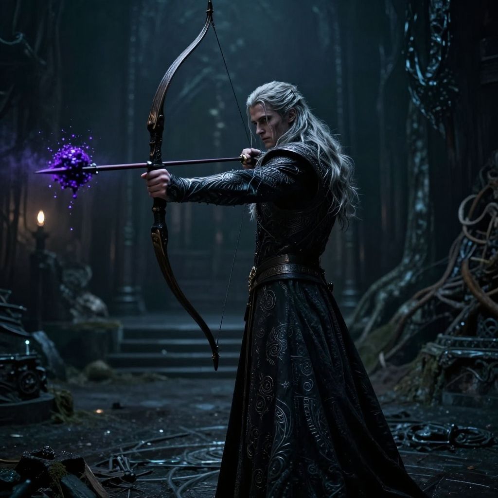 Photorealistic fantasy image: Silver-haired archer in black ornate robe, releasing purple magical arrow in dim, forested, misty background.
