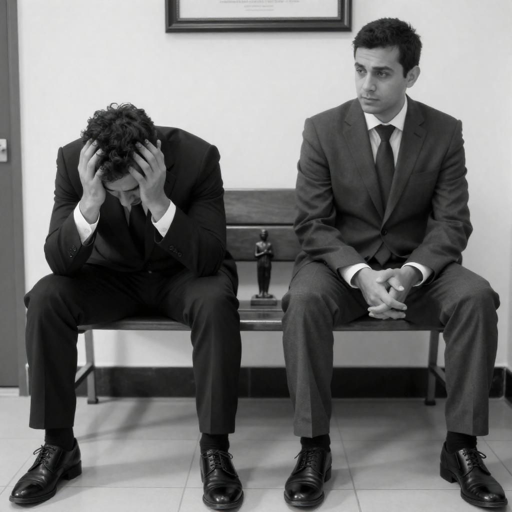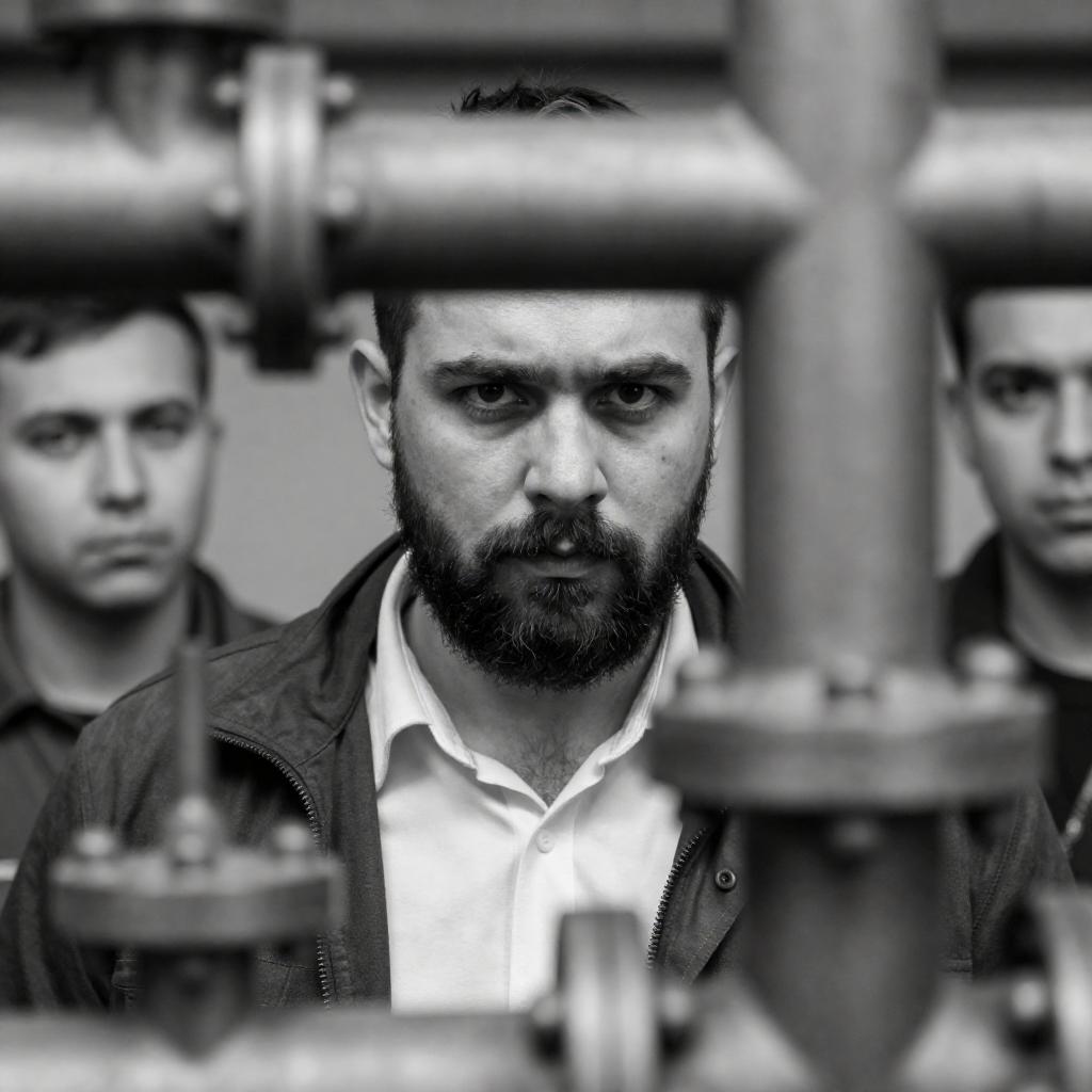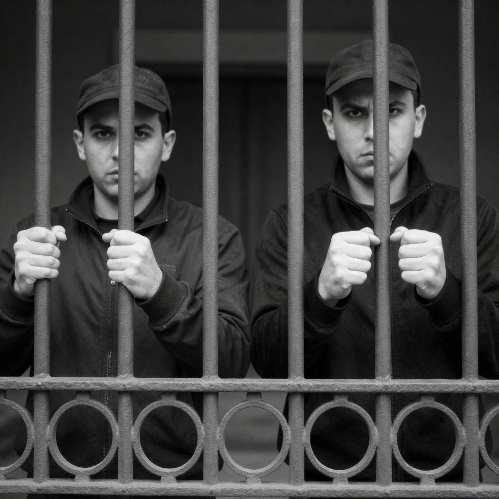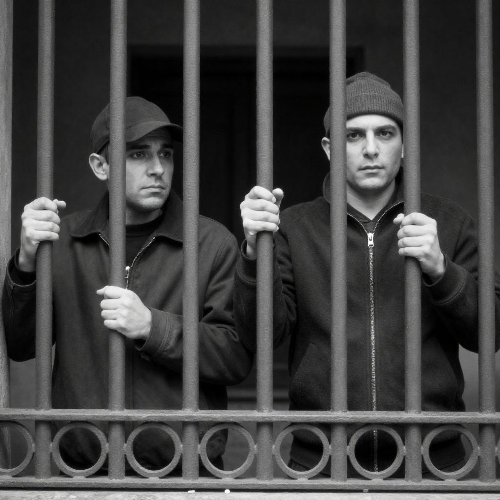 Black and white photograph of two men behind iron bars. Both wear dark clothing and caps. The man on the right has a determined expression, clenched fists. The man on the left has a more subdued expression, holding the bars. Vertical bars and circular patterns on the bars' lower section dominate the foreground.