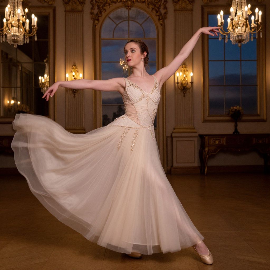 An actress with fair skin, high cheekbones, and expressive green eyes dances in a floor-length elegant dance costume featuring a structured bodice, flowing tulle skirt, and delicate gold embroidery, set in a grand 1920s ballroom at twilight with ornate chandeliers and mirrors in the background.