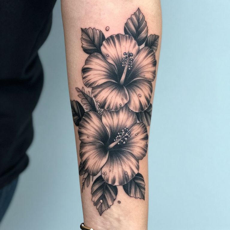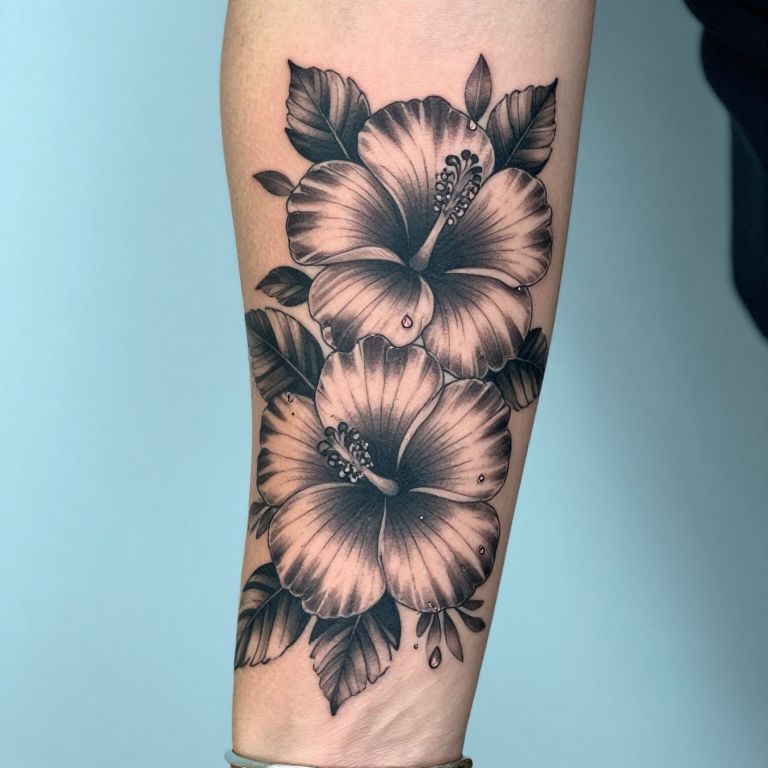 Black and gray tattoo of three detailed hibiscus flowers with droplets, on a forearm. Realistic shading and intricate petal lines. Photograph