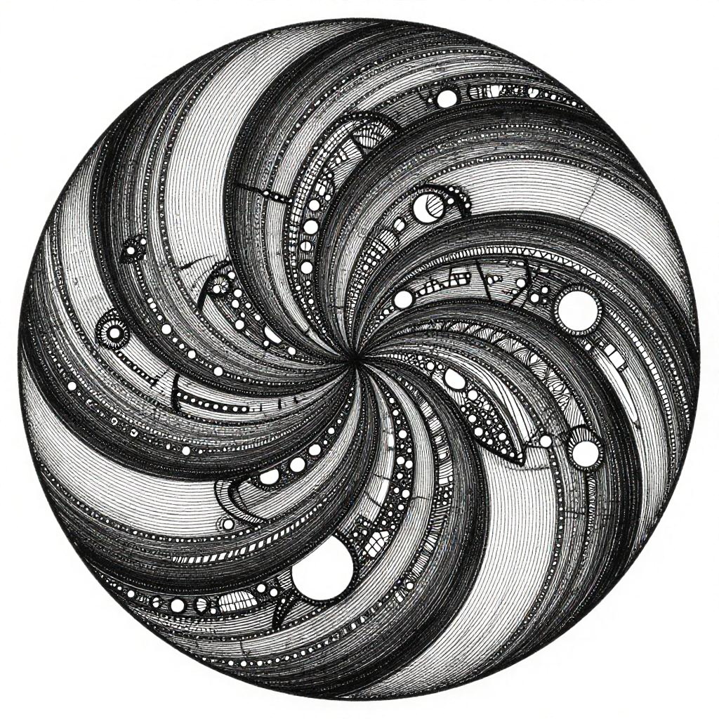 This is a digital black-and-white drawing of a mesmerizing, intricate spiral pattern. The spiral consists of multiple concentric circles with detailed, textured lines and patterns, creating a sense of depth and motion. The design is highly geometric, with fine, precise lines and a monochromatic, almost vintage feel, reminiscent of old architectural drawings or fractal art.