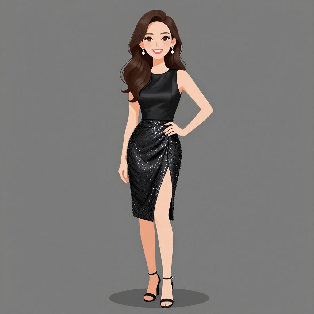 Woman with pretty face and pretty hair. smiling Woman, evening wear, black sleeveless satin top with a high round neckline, knee-length skirt adorned with silver sequins in an abstract pattern, asymmetrical hem with a thigh-high slit, black strappy heels. --sref 1467