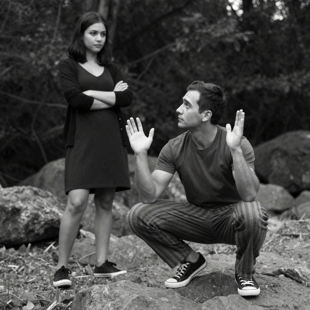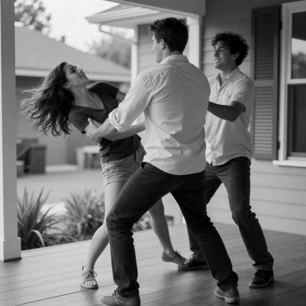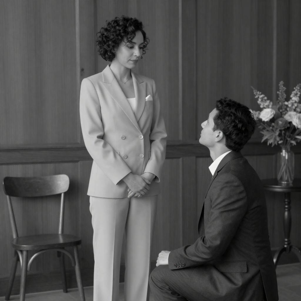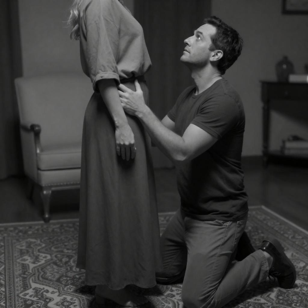 Black and white photograph of a man mid-air jump, right arm raised, left arm bent, wearing a light shirt and dark pants. Kneeling woman with head tilted up, dark dress, white apron. Woman standing in background, watching. Cozy living room with furniture, shelves, and table.