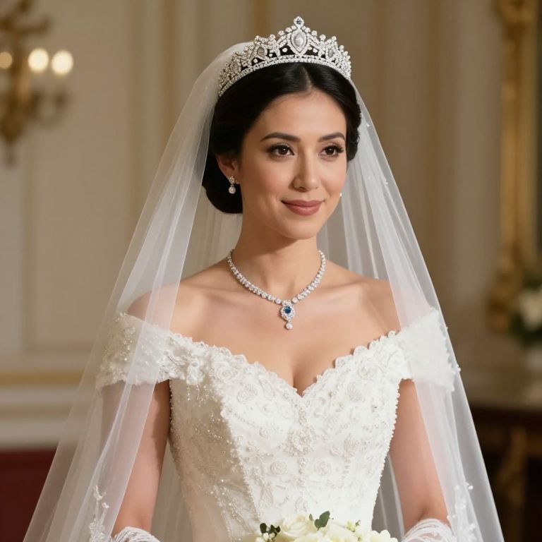 Photograph of a smiling Asian bride with fair skin, dark hair in an elegant updo, wearing a white lace off-shoulder wedding dress with a deep V-neck, adorned with intricate lace patterns. She has a sparkling silver tiara and veil, and a matching diamond necklace with an oval blue gemstone. She also wears white lace gloves. The background features a softly lit, ornate room with cream-colored walls and gold accents, including a wall sconce and framed artwork, creating a classic, elegant atmosphere.