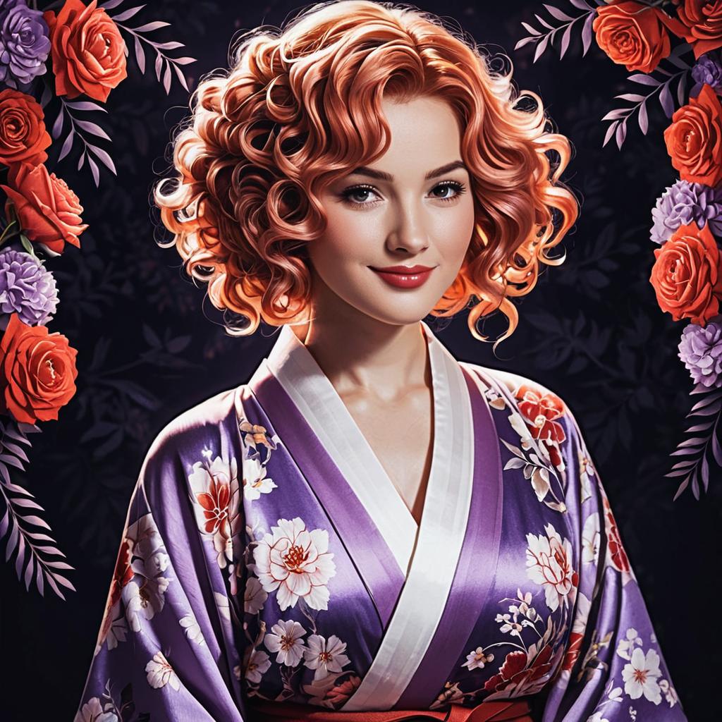 Digital artwork of a serene anime-style woman with moonlit gray curly hair, wearing a warm brown sweater and plum skirt. She is surrounded by a wreath of vibrant red and white flowers against a dark, moody background. The image features intricate floral details and soft lighting that highlights her peaceful expression and relaxed brows, creating a romantic and elegant ambiance.