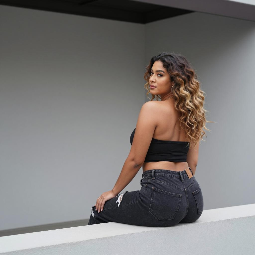 1girl, woman, large breasts, wearing ultra-short bandeau crop top and high-waisted relaxed-fit ripped jeans in black bandeau top with dark indigo jeans on mixed-heritage woman with wavy ombré hair and soft glam posed sitting on a low wall with her back to the viewer, looking over her shoulder in minimal outdoor corner with smooth light grey wall at Harajuku fashion street in Tokyo under diffused shade under an awning with gentle highlights, laid-back summer lifestyle fashion photography, high resolution, ultra-detailed