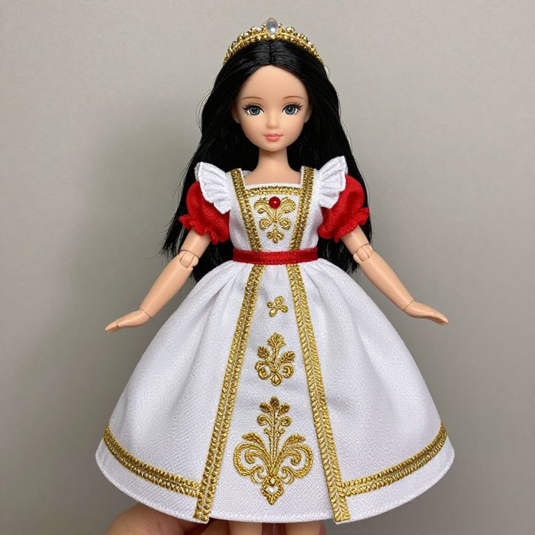 Doll wearing white dress with gold embroidery and red accents.