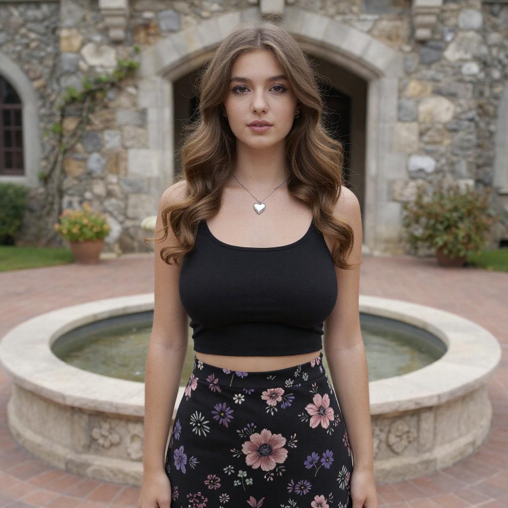 Photograph of a young woman with long, wavy brown hair and fair skin, standing in front of a stone castle with an arched doorway. She wears a tight black crop top, highlighting her medium-sized breasts, and a black floral skirt with pink and purple flowers. She has a silver necklace with a heart pendant. A circular stone fountain is in the background, with greenery and a tiled courtyard.