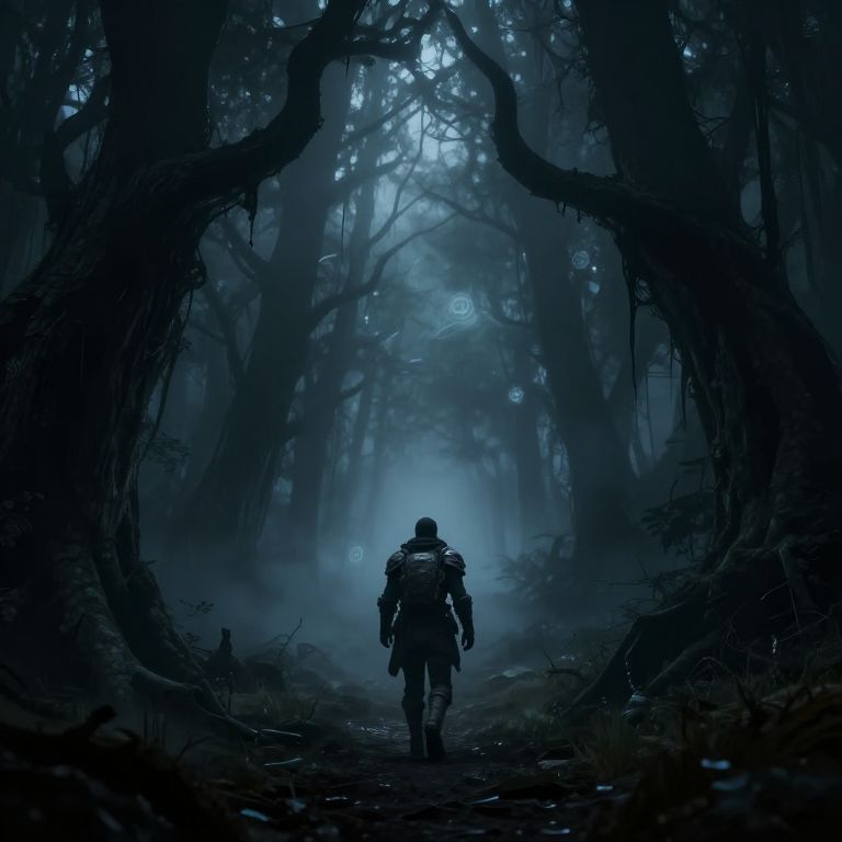 Digital artwork: Silhouetted lone warrior in dark armor walks down a misty, eerie forest path, framed by twisted, shadowy trees under