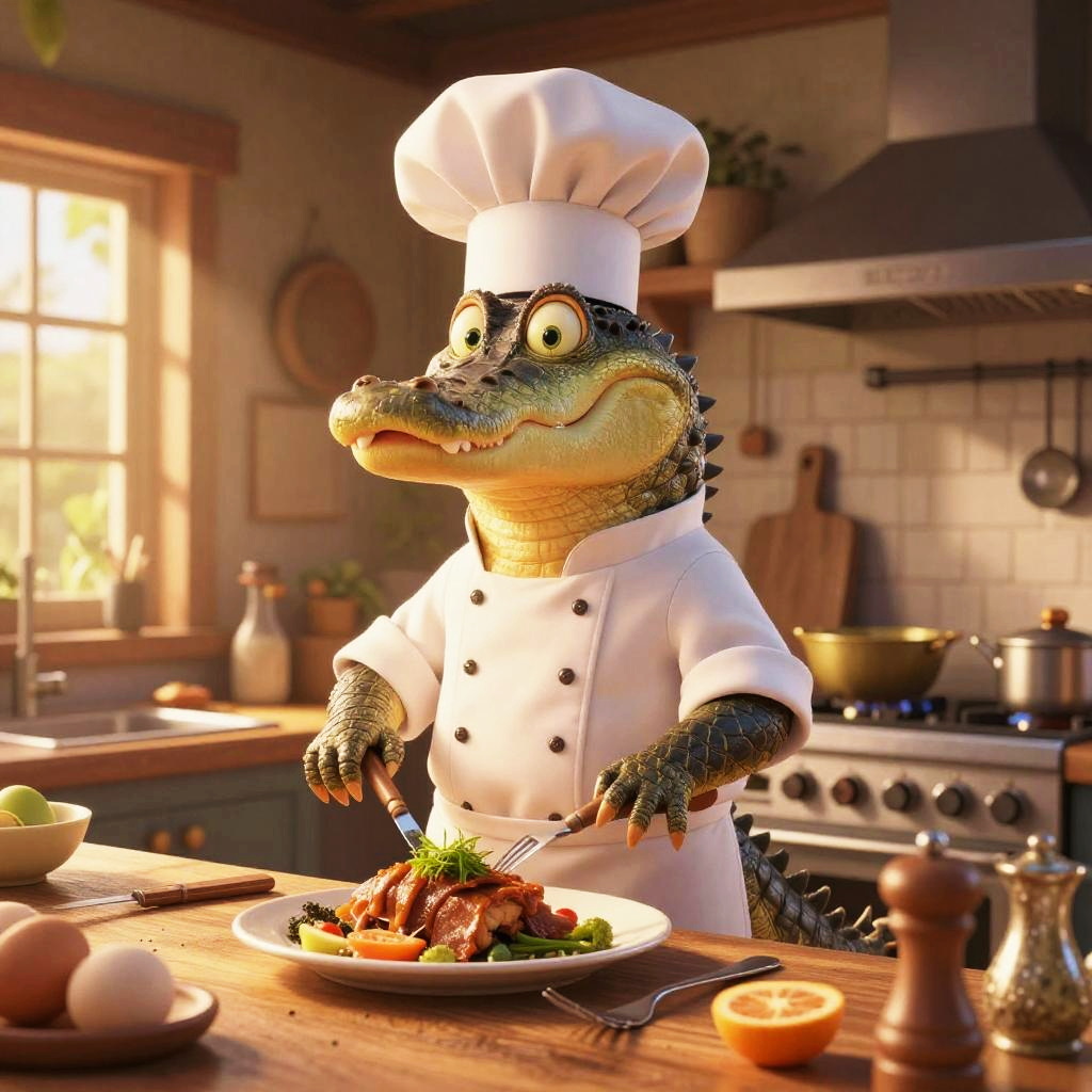 Cartoon Chameleon Chef in Kitchen