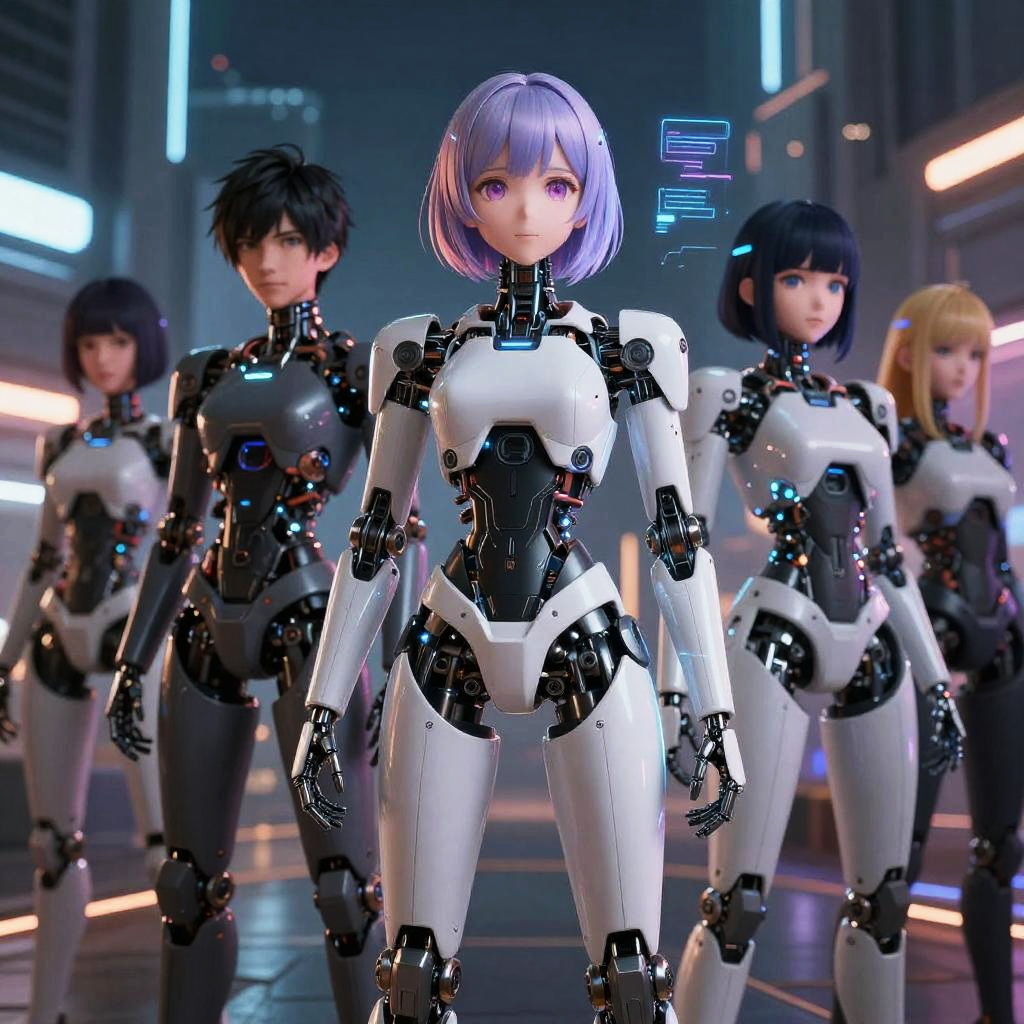 Anime characters AI, group of diverse high-tech anime figures, sleek robotic limbs combined with soft anime aesthetics, glowing holographic elements, sci-fi urban setting at night, detailed shading and lighting, immersive digital atmosphere