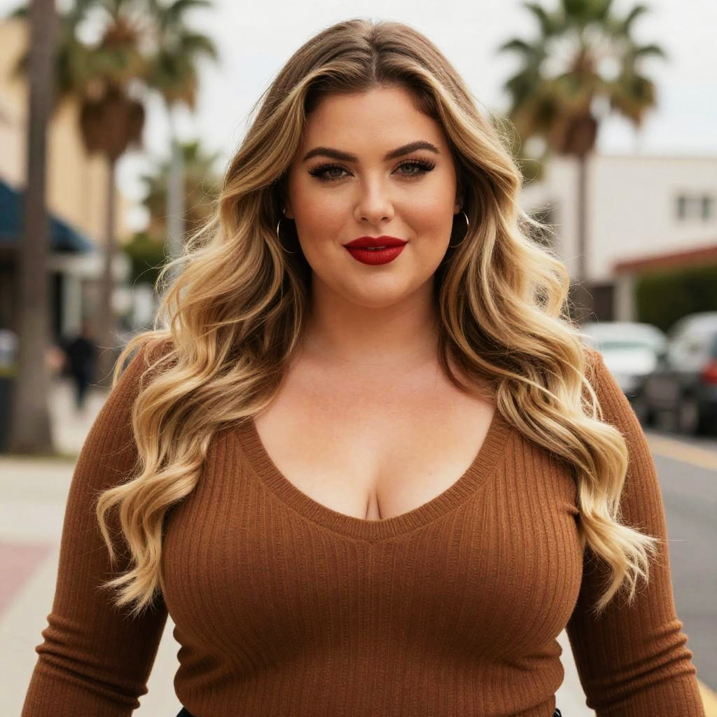 Photograph of a curvy woman with long black hair, wearing a deep red, low-cut dress with a high slit, black high heels, and glasses. She holds a brown handbag in her right hand and touches her hair with her left. She walks on a sunny street with a blue car and greenery in the background.