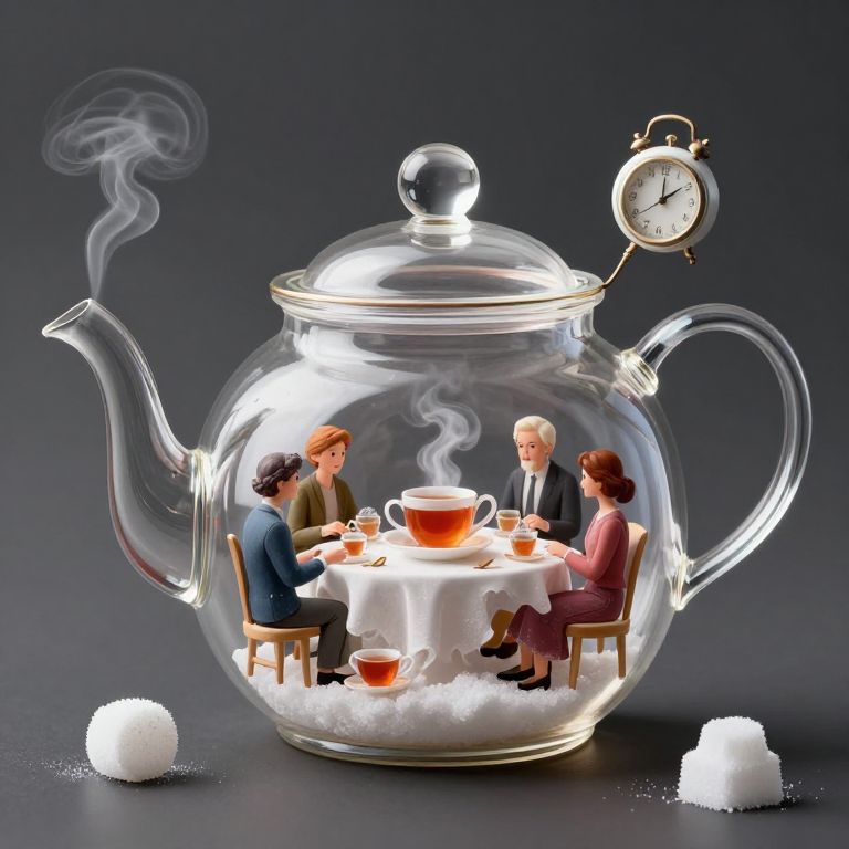 A tea party held inside a floating teapot, where time stretches and folds, and guests include sentient steam and clocks made of sugar.
