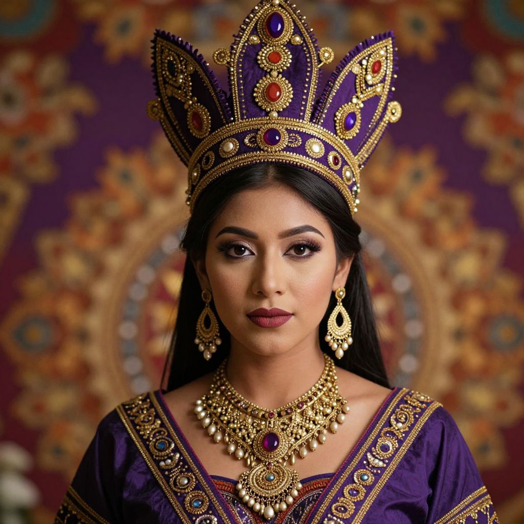 An intricately adorned indigenous woman in an ornate purple and gold headdress, with a sharp focus on her elegant necklace and earrings, set against a vibrant, luxurious background with rich colors and cinematic lighting.