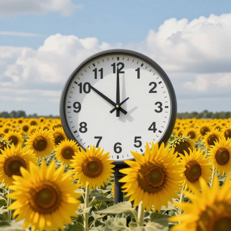 Sunflowers bloom vibrantly in a golden field, with a large clock positioned centrally, its hands pointing to 10:10, blending seamlessly among the natural surroundings under a partly cloudy sky.