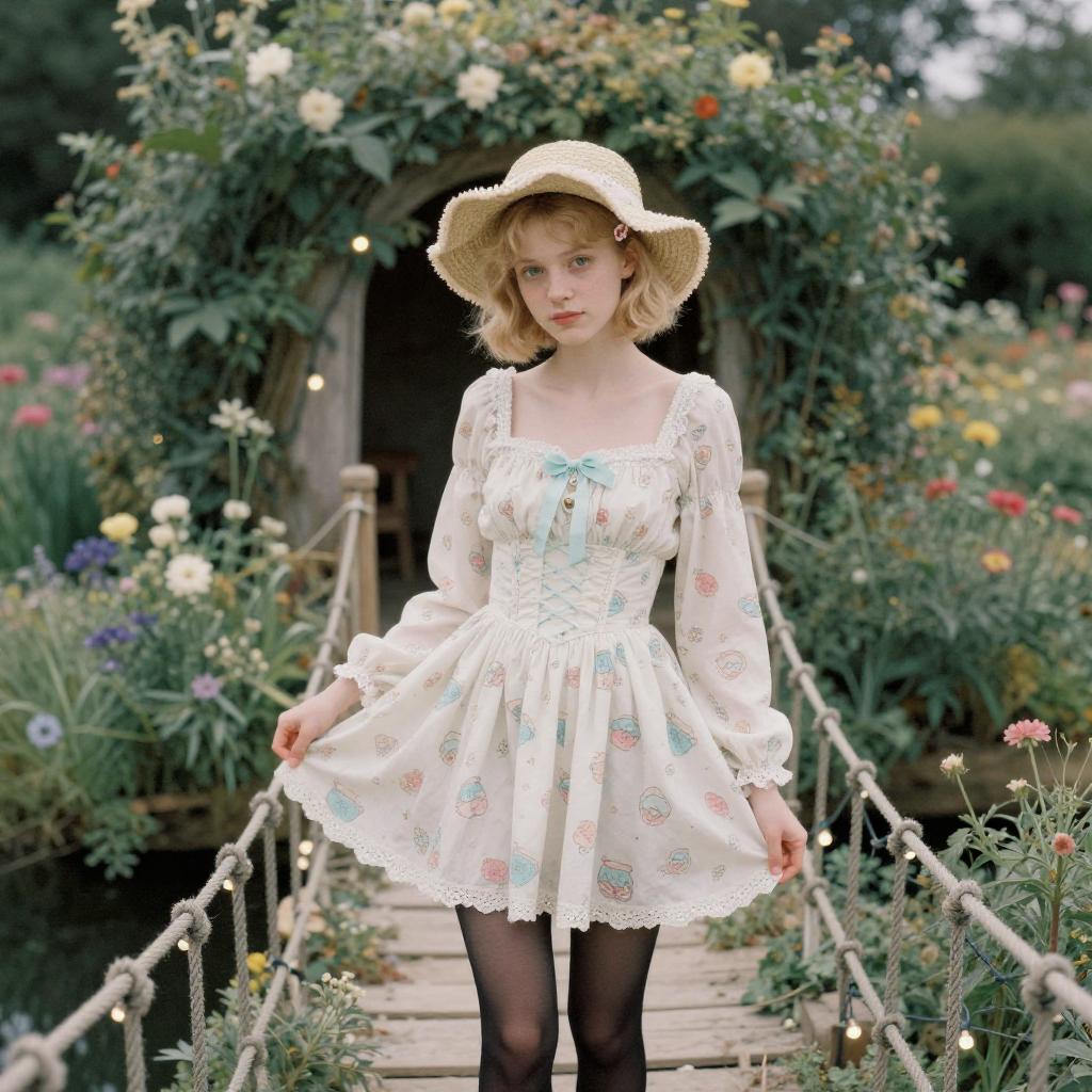 Analog photo, retro, a cute girl, 18 years old, outdoors, wild nature, hair oreola, medium breast, hair ornaments, realistic detailed skin, ((short hairs:1.3)), film grain, raw photo, ((pale skin)), fit body, slim body, sunny day, flowers, posing, nsfw, ((shy weak smile)), ((black stockings)), green eyes, (blonde:1.3), (sharp focus:1.2), ((cotton))dress, (cincher), sun hat, floral print, lace, bow, standing long sleeves, sleeves past wrists, rope bridges, soft fairy lights, hidden nook, dreamy escape, ((garden)), ((short)) skirt, skirt lift, thighinghs, ((white dress)), cute pink and blue panties print, head, standing, solo