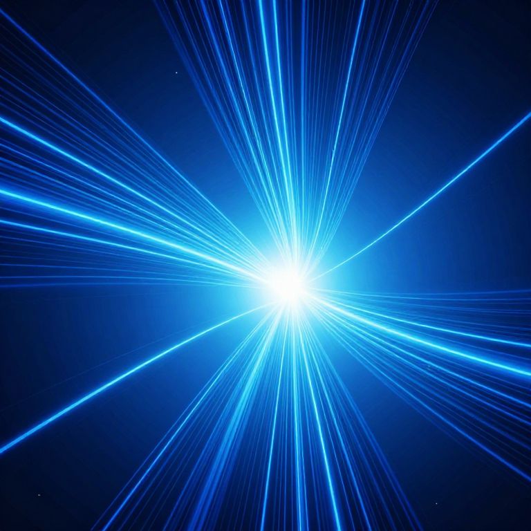 Photograph of a bright white light source at the center, surrounded by numerous vivid blue light rays radiating outward in all directions. The background is a deep blue, creating a stark contrast with the intense brightness and color of the light beams. The image has a dynamic, almost cosmic feel, with the light rays appearing sharp and focused, resembling a burst of energy or a starburst effect. The overall composition is symmetrical and visually striking.