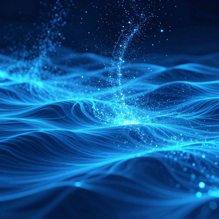 The image presents a high-tech abstract background with a striking blue color scheme that conveys a sense of energy and dynamism. The composition features a series of curved lines and light streaks that create a sense of movement and flow. The bright lights at the center of the image emit a radiant glow, drawing the viewer's eye towards the center. These lights are surrounded by a series of curved lines that fan outwards, creating a sense of depth and dimension. The background is a deep, dark blue, which contrasts sharply with the bright lights and curves, enhancing the overall visual impact. The interplay of colors, textures, and shapes creates a visually captivating and dynamic scene that conveys a sense of high-tech sophistication and energy.