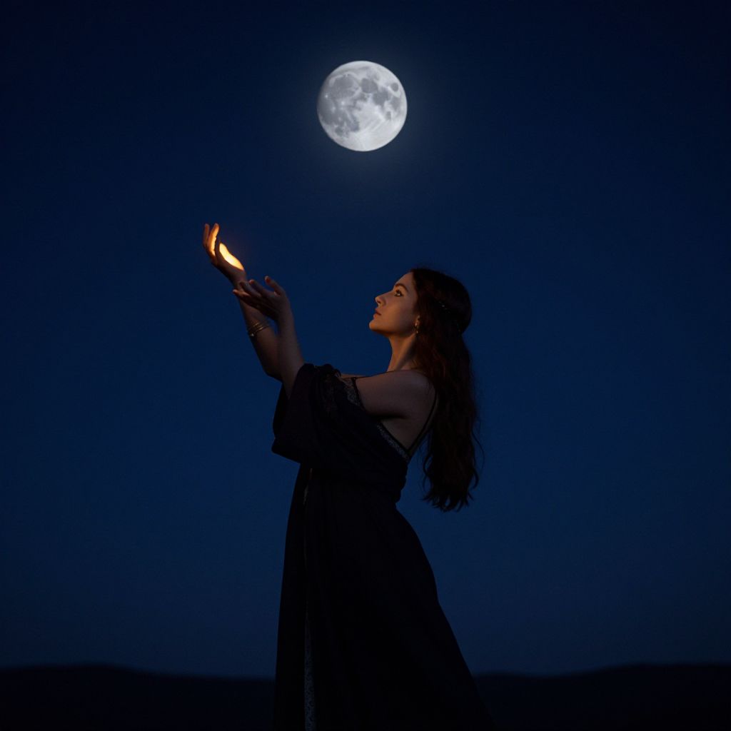 Photograph of a woman with long dark hair, in a black dress, holding out her hands to a glowing full moon against a deep blue night sky