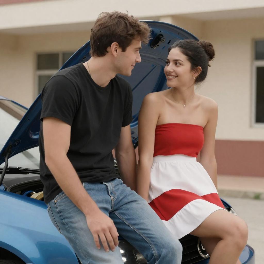 Photograph of a young couple standing outdoors, holding hands and gazing at each other. The woman has long brown hair and wears a light green short-sleeved top. The man has dark brown hair, a beard, and is dressed in a blue polo shirt. A blue car and greenery are visible in the blurred background.
