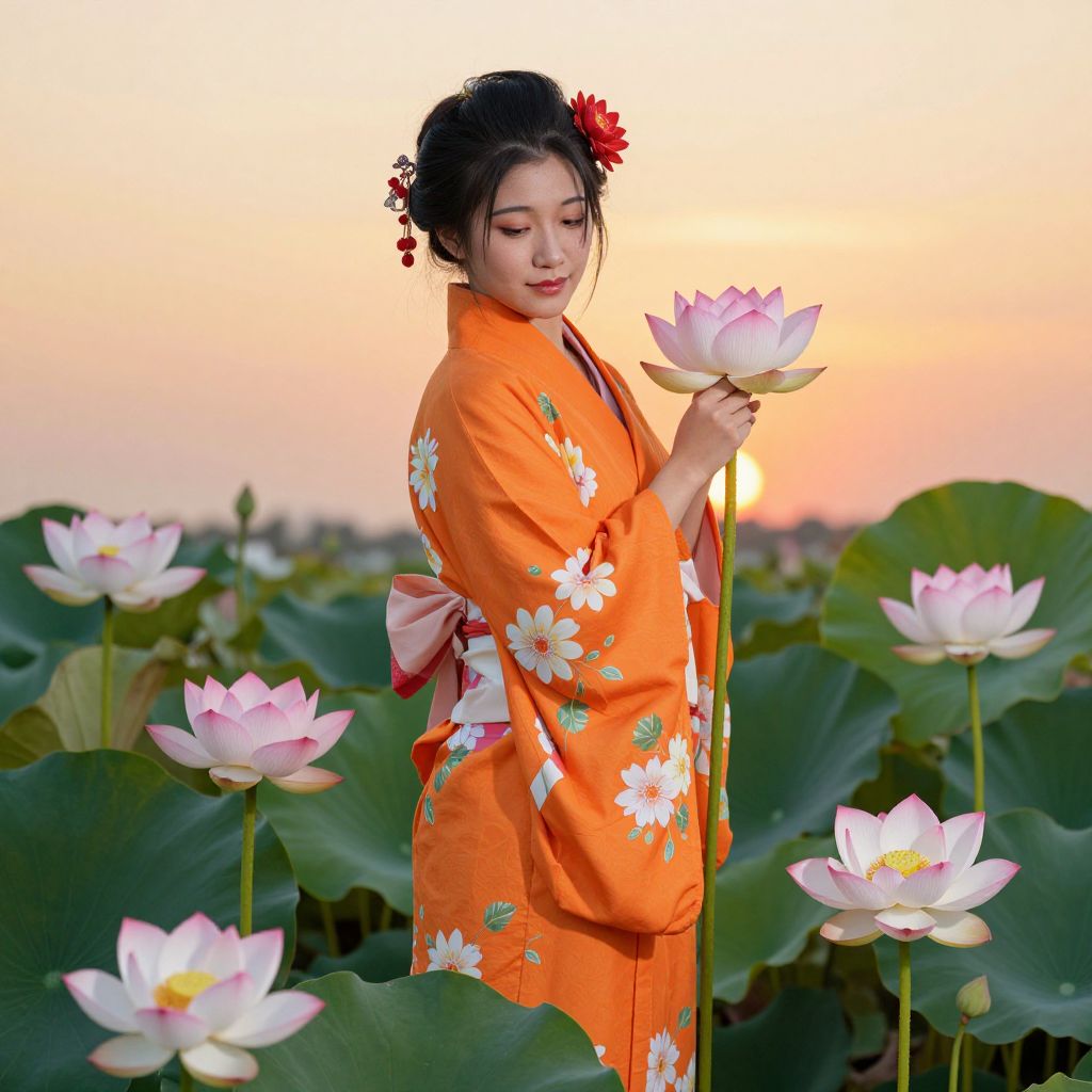 Elegant Asian woman adorned in a vibrant orange floral kimono, her hair styled with a red lotus flower accessory, gracefully holds a delicate pink lotus blossom while surrounded by six blooming lotus flowers and lush green leaves against a serene sunset backdrop.