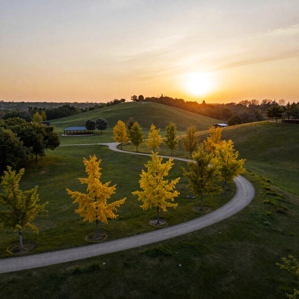Aerial photo of a sunlit, lush green park during sunset. Curving gravel paths weave through vibrant yellow and green trees. The sun casts a warm orange glow over the rolling hills and open grassy areas. A small clearing with a wooden structure is visible in the background. The scene is peaceful and picturesque, with the golden light enhancing the natural beauty of the landscape.