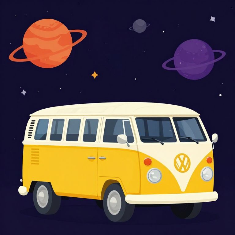 Flat 2D illustration of a yellow and white Volkswagen bus set against a dark space background featuring orange and purple planets with rings, along with stars. The image combines retro vehicle design with a cosmic theme.