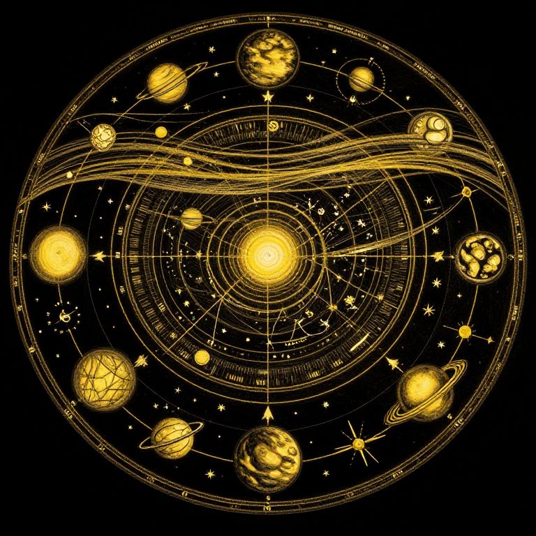 Artistic illustration of an astronomy calendar featuring a circular arrangement of planets and celestial schemes drawn in yellow gold pencil style on a deep black background. The design shows the sun at the center with orbiting planets and star patterns around it, inspired by vintage astronomical charts.