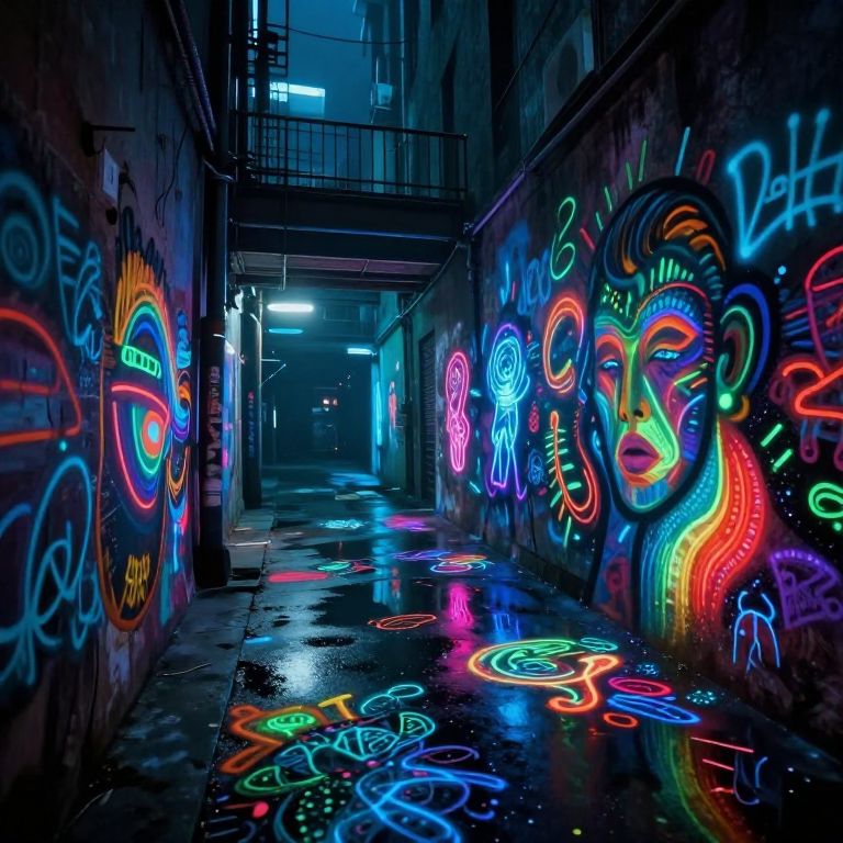 Neon-lit urban alleyway at night, vibrant graffiti on walls and ground, colorful street art, wet pavement reflecting lights, industrial setting.