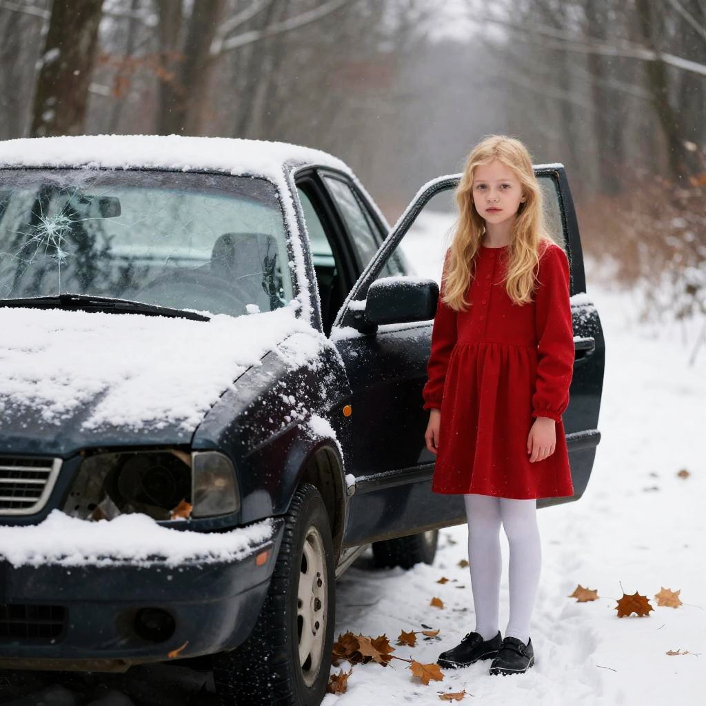 Photograph of three children in a snowy forest. Blonde girl with curly hair and choker holds a wooden puppet with a red flower, center. Brown-haired boy in red military-style jacket, right. Blonde girl in silver dress, left. Snow-covered trees in background. All children have serious or neutral expressions.