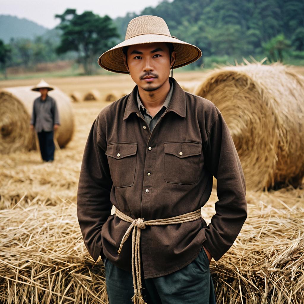 Chinese farmer outfit, photorealistic, Asian man, wearing brown long-sleeve shirt, tied at waist, brown wide-brimmed hat, standing in front of stacked hay, outdoor, daytime, serious expression, medium shot, natural light, traditional rural clothing, subtle ures, background blur, realistic colors, focus on subject