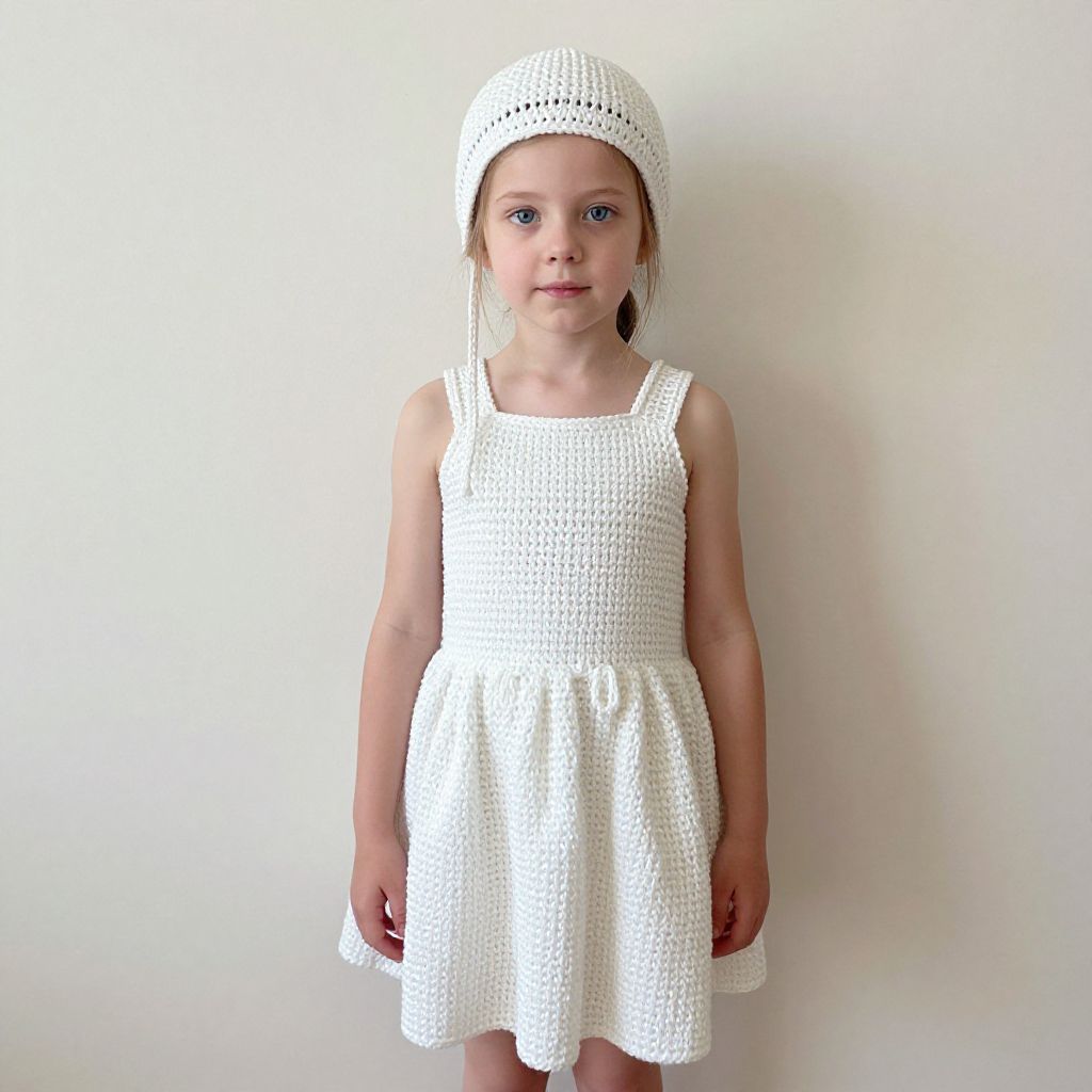 Child crochet costume, solo, 1girl, dress, child, looking at viewer, realistic, standing, blue eyes