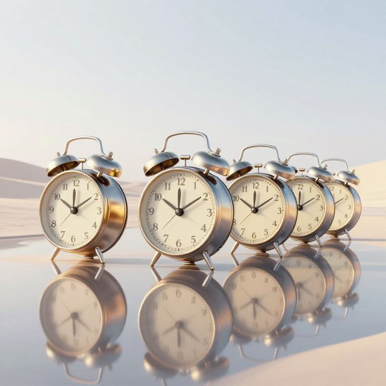 Photograph of six identical silver alarm clocks with white faces and black numerals, arranged in a row on a glossy, reflective surface. Each clock shows a different time, ranging from 12:00 to 11:59. The background is a gradient of light blue to white, creating a serene, early morning or late afternoon atmosphere. The clocks' reflections are mirrored on the shiny surface, adding depth to the image. The photograph has a modern, clean aesthetic with a focus on symmetry and reflection.