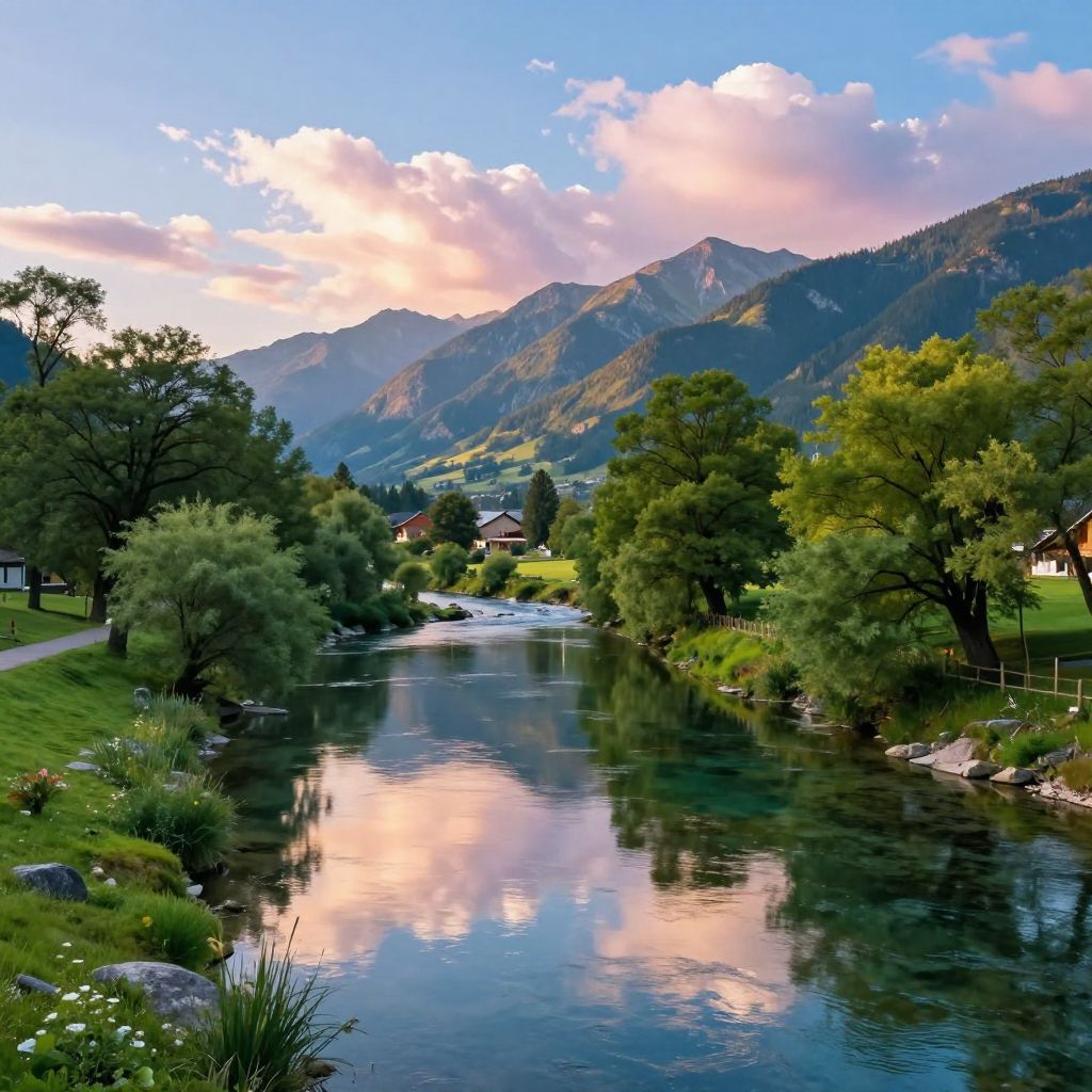 Photograph of a serene, forested lake with a calm, turquoise blue surface. In the foreground, a brown and white dog swims near the center, its head and shoulders above water. Tall, dense evergreen trees surround the lake, with sunlight filtering through their foliage. In the background, majestic mountains rise under a partly cloudy sky. The dog's fur is wet and slightly reflective, and ripples spread from its movement. The lush greenery contrasts with the dark trees and the bright sky.