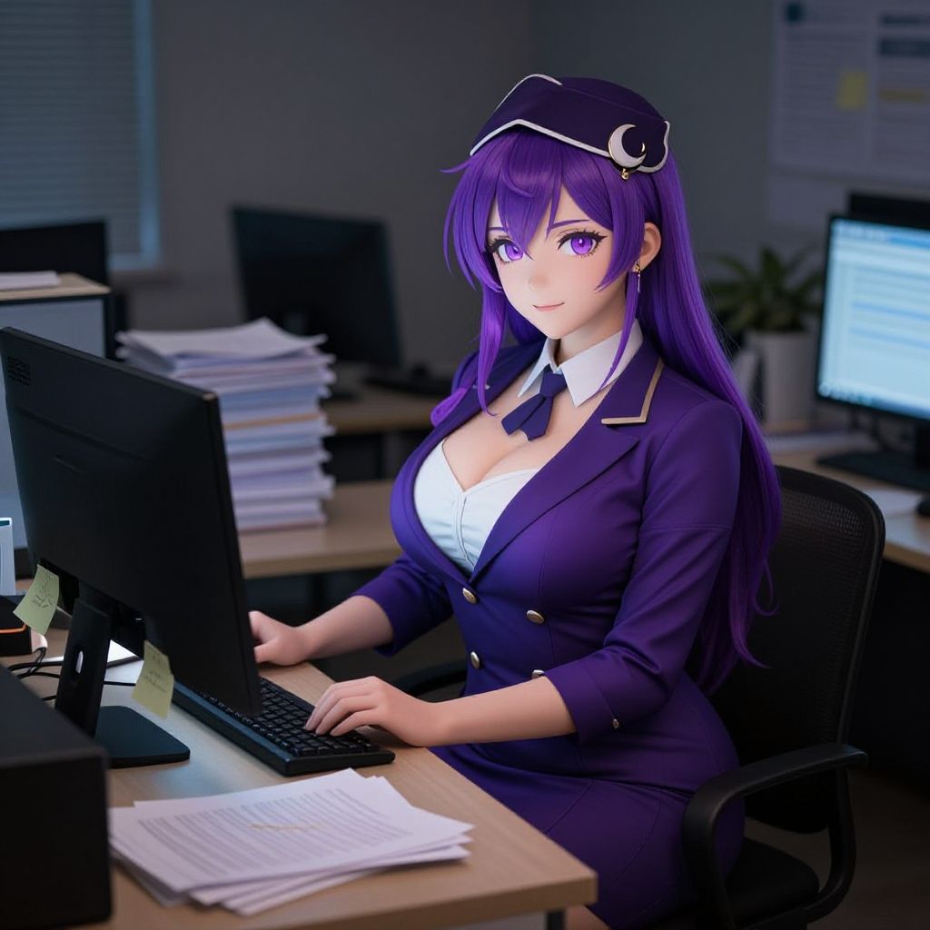 Digital anime-style artwork of a purple-haired woman in a navy blazer and tie, sitting at a desk with monitors, typing. Office background with stacks