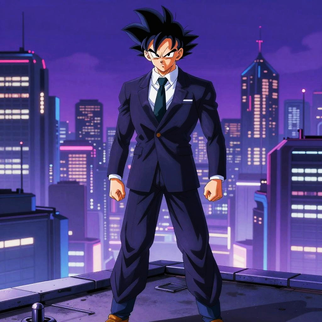Vegito in an elegant dark suit with a slim fit, posed heroically on a rooftop overlooking a neon-lit futuristic city, intricate anime-style shading, strong composition with vibrant purple and blue hues, emphasizing power and sophistication.