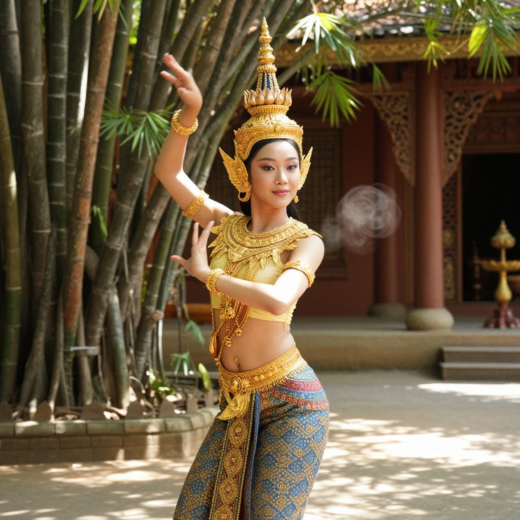 Photograph of an Asian dancer in ornate gold and blue traditional Thai attire, posing gracefully outdoors among bamboo trees and a temple-like structure.