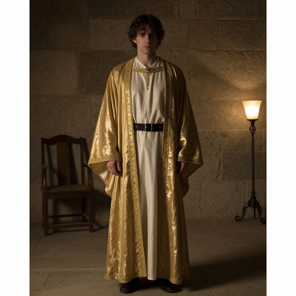 Photograph of a young man with curly dark hair, standing in a dimly lit stone-walled room. He wears a long, gold, embroidered robe over a white satin tunic, cinched at the waist with a black belt. The robe has intricate patterns and a luxurious sheen. He stands centered, facing the camera, with a serious expression. To his right, a lit floor lamp casts a warm glow, and to his left, a dark wooden chair is partially visible. The stone wall in the background has a rough texture, adding an ancient, medieval feel to the scene.