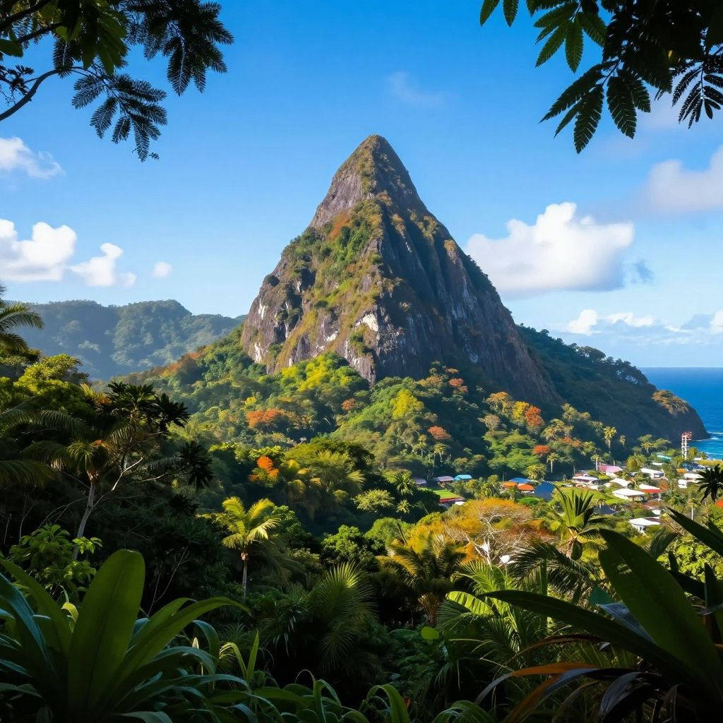 Digital art, landscape of a Saint Lucia from inside of a Peninsula, Awe-Inspiring, Clear skies, Vivid, colorful, lush, ambient light, detailed, highly decorated, dynamic background, advanced cinematic perfect light, professional creative, set logical ambient background, contemporary