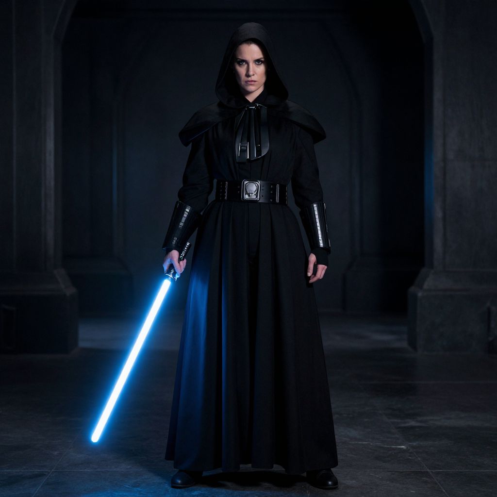 Photograph of a woman standing in a dark, stone-walled room. She has a stern expression and wears a black, high-collared, long-sleeved cloak with a shiny, leather-like texture and a wide belt with a silver buckle. Her dark hair is partially visible under a black hood. She holds a bright blue lightsaber in her right hand, which illuminates her face and part of the floor. The background is dimly lit, emphasizing her and the glowing lightsaber. The overall atmosphere is dark and mysterious, with a sci-fi fantasy aesthetic.