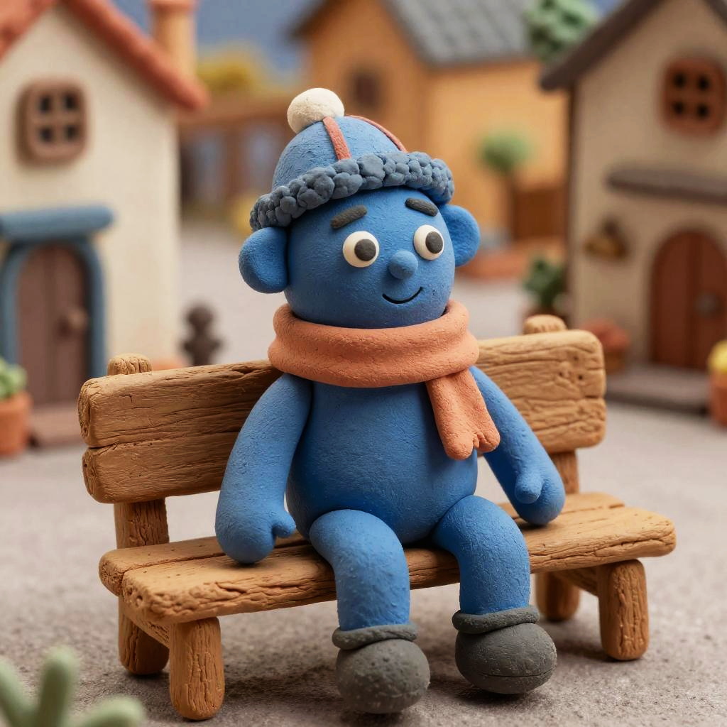 A blue claymation character exploring an enchanted cave made of translucent crystals and glowing stalactites, curious expression, intricate clay textures with subtle fingerprints, soft contrasting shadows, magical and mysterious vibe.