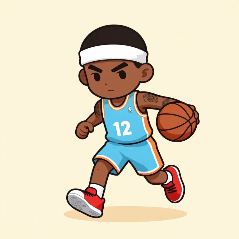 The image depicts a cartoon character illustration of a young basketball player, reminiscent of LeBron James. The character is depicted in a dynamic running pose, holding a basketball in one hand and appearing determined and focused. The character is wearing a light blue and orange basketball jersey with the number 12, white shorts, and red sneakers with white soles. The character has a white headband and is adorned with tattoos on both arms. The background is a simple, light beige color, which helps to highlight the character and the basketball. The overall composition is well-balanced, with the character centrally positioned and the basketball adding a sense of motion and energy to the scene.