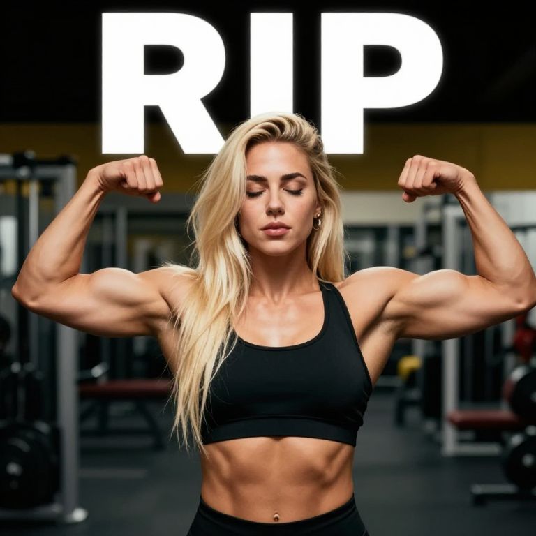 Photograph of a muscular, blonde woman in a black sports bra, flexing her arms in a gym, with bold "RIP" text in