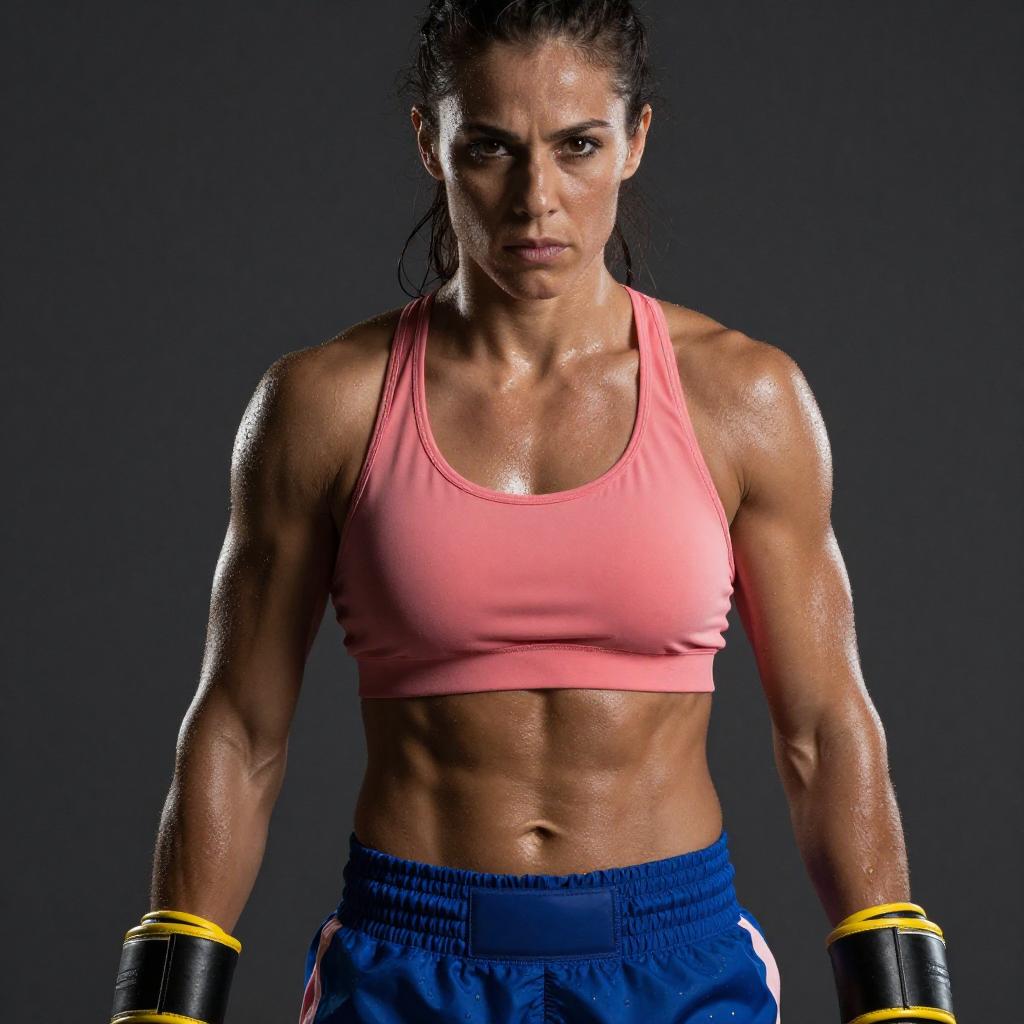 Photograph of a muscular, tan-skinned woman with dark brown hair in a ponytail, wearing a black sports bra and gray, ripped shorts. She has bandaged hands and is leaning forward, highlighting her defined abs and biceps. The background is dark with vertical light reflections. Her intense gaze is directed at the camera.