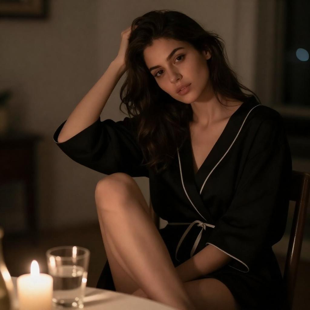 Photograph of a woman with wavy dark brown hair, wearing a white, ured bathrobe, sitting in a red chair by a window at night. She smiles softly, resting her head on her hand. The background shows blurred city lights through the window, with white curtains partially drawn.
