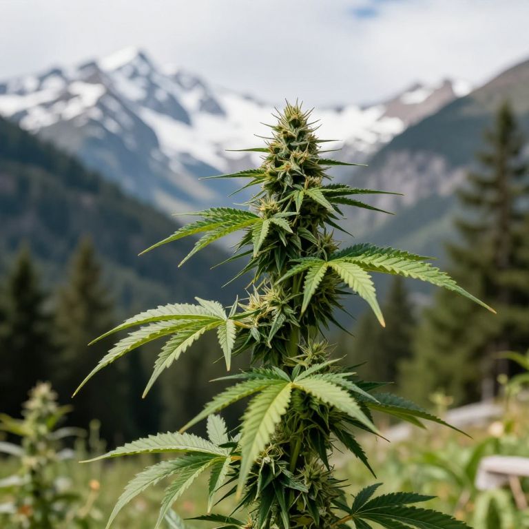 Thriving cannabis plant stands prominently in a serene mountainous landscape, its vibrant green leaves contrasting against the backdrop of snow-capped peaks and lush evergreen trees.